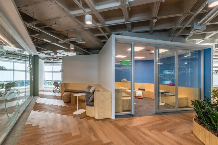 設計師在設計時將重點集中在曲線造型上面,在所有不同區域之間進行過度的串聯,引導人們穿過空間,甚至能夠讓顧客帶著一顆好奇心,去探索在曲線造型后的空間。明亮色彩的木材、地板以及工作站內深藍的色板形成對比,創造出生動而極富靈感的工作場所。也可以方便與客戶交談旅行方式時有一個安靜的辦公場所,讓顧客靜靜地挑選。