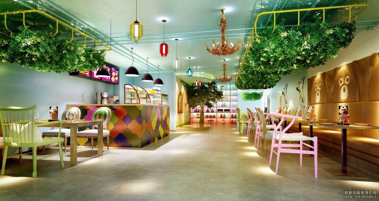 3.燈光色彩:燈光色彩是對兒童主題餐廳氛圍營造的重要因素。要注意選擇歡快、明亮的燈光色彩,營造溫馨、舒適的童趣世界,激發孩子們的食欲。小孩子們對鮮艷的色彩是比較偏愛的,因此注意避免選擇冷色調進行大面積裝飾,可以暖色調為主,冷色調為輔,相輔相成,共同營造。